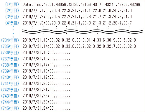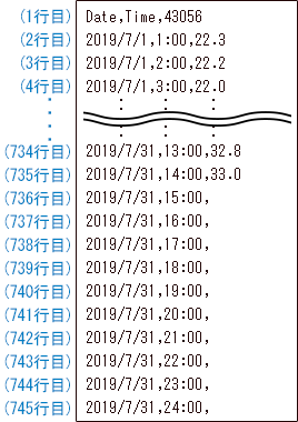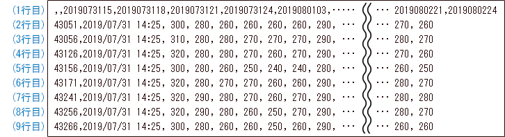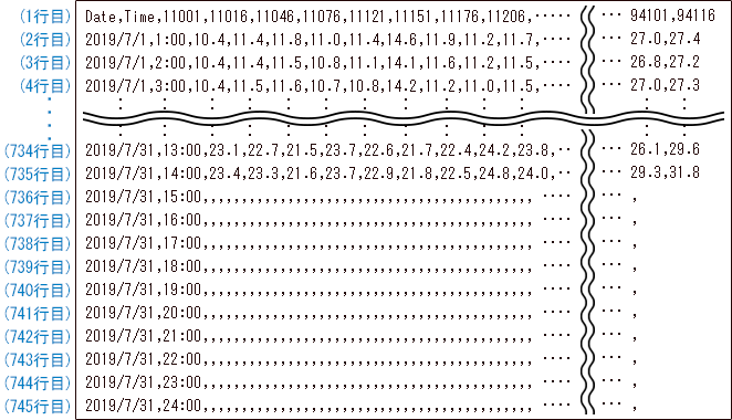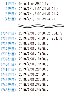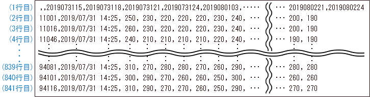 2行目以降は、日付、時刻と、1行目の地点番号に対応する地点の、暑さ指数の実況値が格納されます。